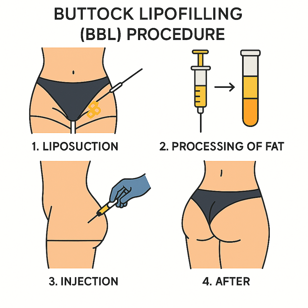 Buttock lipofilling, also known as a Brazilian Butt Lift (BBL), is a cosmetic procedure that enhances the volume, shape, and contour of the buttocks using the patient’s own purified fat. Unlike implants, which rely on silicone devices, lipofilling uses natural tissue harvested from areas such as the abdomen, thighs, flanks, or back. This dual approach not only refines body proportions through liposuction but also restores balance and harmony to the silhouette by transferring fat where it is most desired.