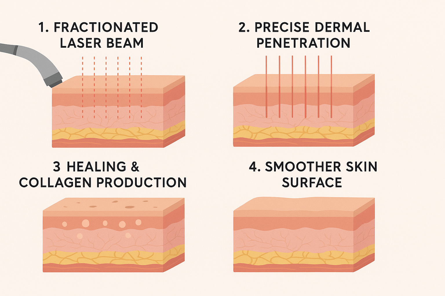 Fraxel works through controlled thermocoagulation. The laser delivers fractional energy into the dermis, gently vaporizing superficial layers of the epidermis while preserving zones of healthy tissue. This dual action both resurfaces the skin and stimulates deep remodeling, encouraging collagen renewal. Patients may feel a sensation of warmth or mild heat during the session, often eased by the use of cold air to cool and calm the skin throughout treatment. The technique is carefully calibrated to minimize discomfort while maximizing rejuvenation.