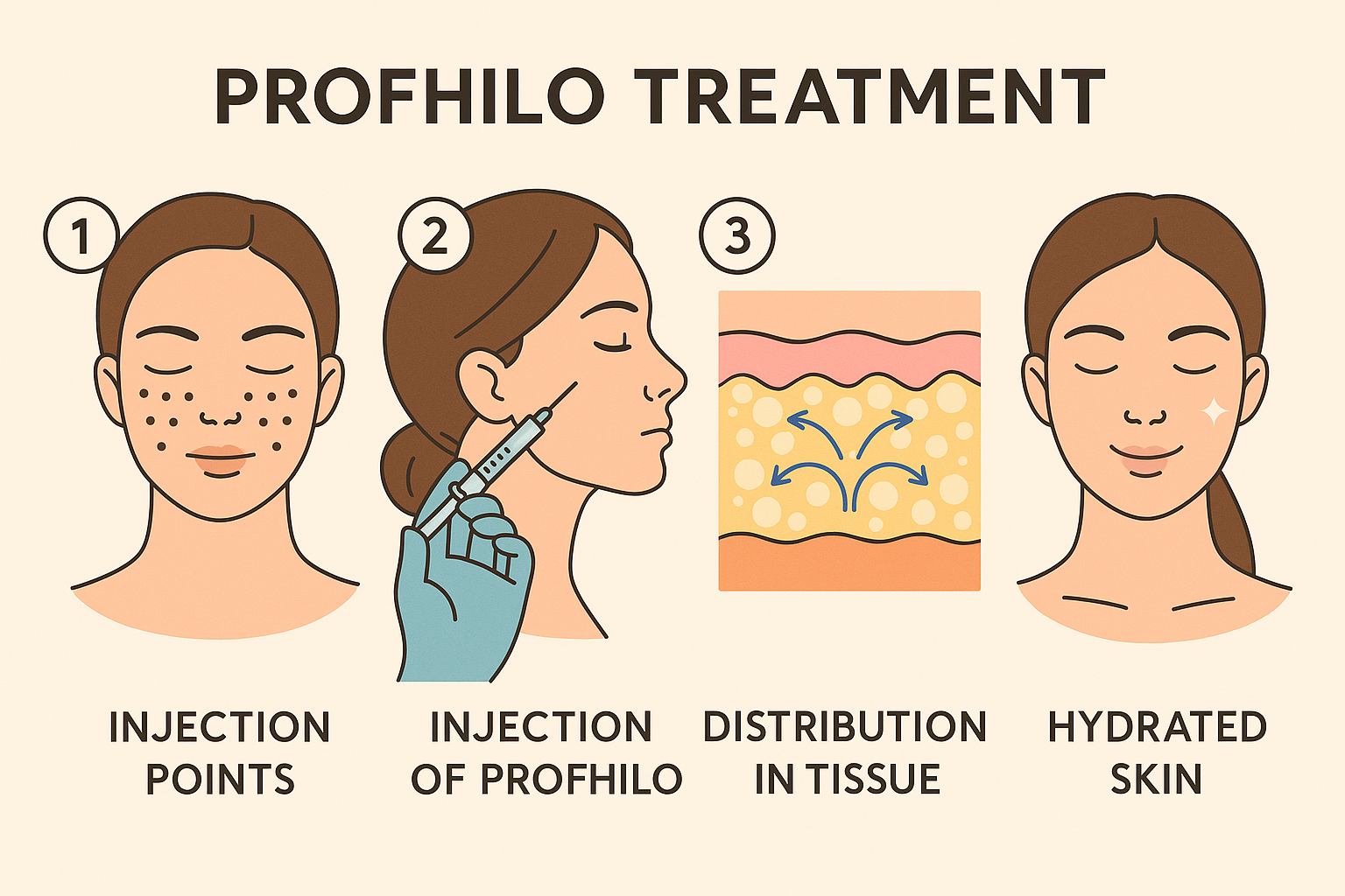 Profhilo is injected at carefully mapped points on each side of the face (usually five per side). From these points, the hyaluronic acid spreads smoothly beneath the skin, nourishing and stimulating the tissue.