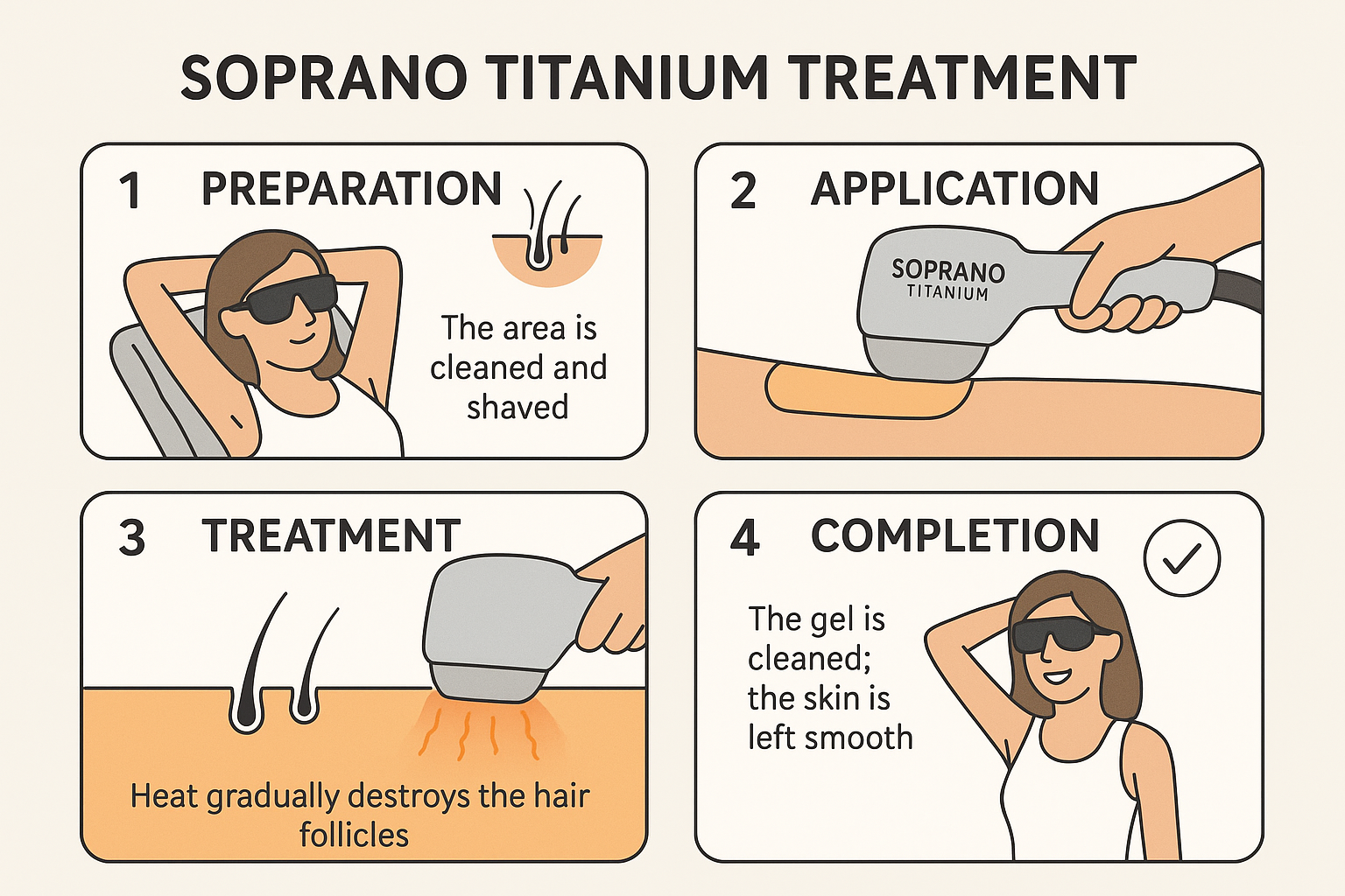 Soprano Titanium is completely non-invasive and does not require anesthesia. Its advanced cooling technology ensures the treatment remains comfortable throughout.